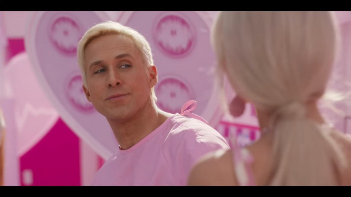 Для Кена пляж — это жизнь. Как уморительно объясняет он в начале фильма, его работа — это пляж, поэтому вполне логично, что он так выглядит, когда мы впервые его видим. На Кене пастельная розово-зеленая полосатая рубашка и такие же шорты. Цветовое сочетание великолепно, а нежные оттенки действительно выделяются на фоне пляжной техноцветовой обстановки. Кажется, что это квинтэссенция Кена, и она идеально подходит для пляжного отдыха. Также очень уместно, что Кен оставляет рубашку расстегнутой, чтобы продемонстрировать свое впечатляющее телосложение — еще одна попытка привлечь внимание Барби.