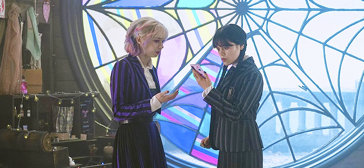 Забавно, что "Невермор" "переехал" севернее - съёмки проходят в Ирландии и уроженка солнечной Калифорнии Дженна Ортега закуталась в пальто. Может от этого она стала заметно угрюмей?