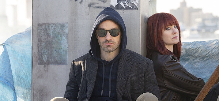 В середине серии Сорвиголова минуту-две сидит среди ящиков в порту (как медведь в кустах) и говорит с Карен.